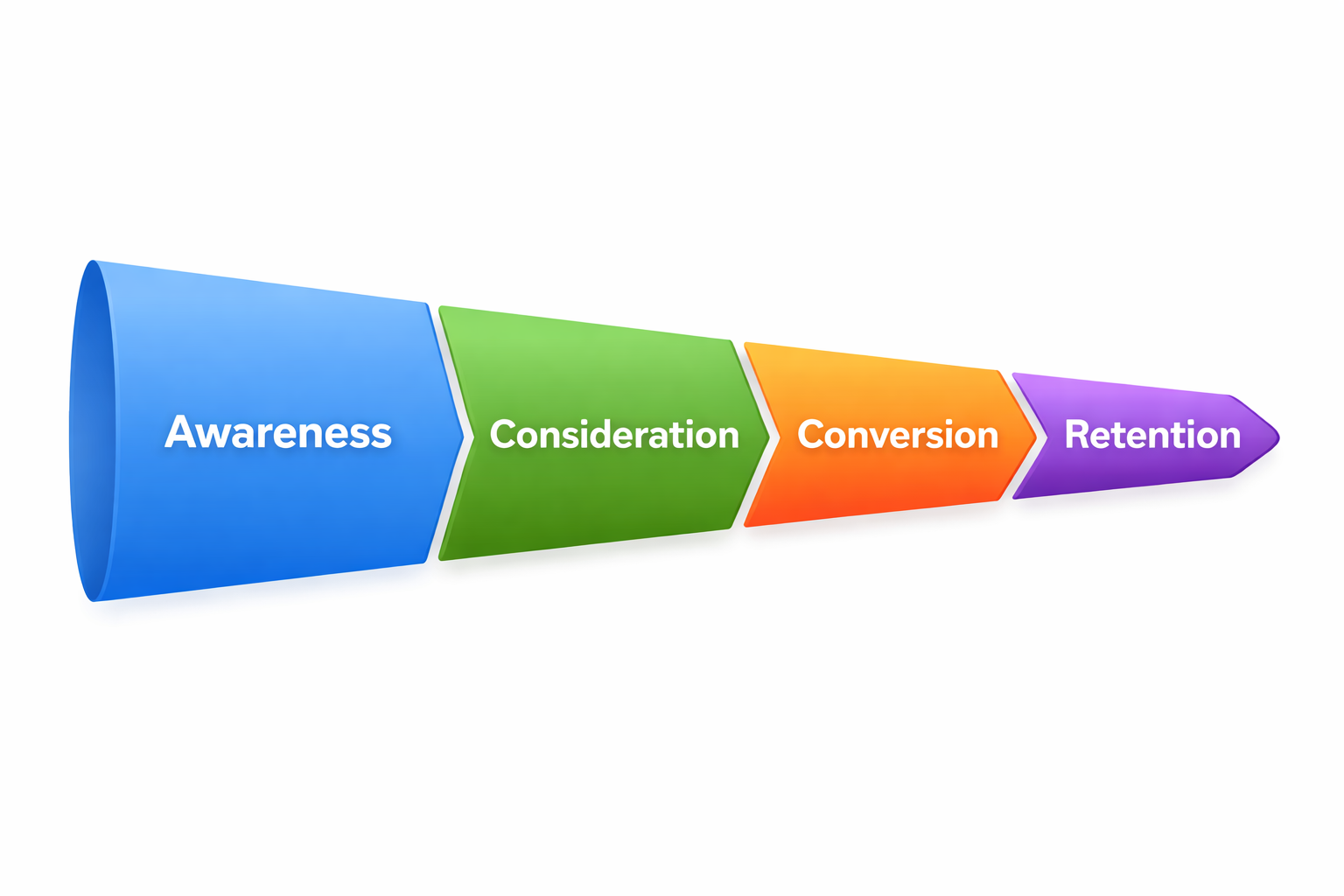 Marketers think about the customer journey: awareness, consideration, conversion, retention.